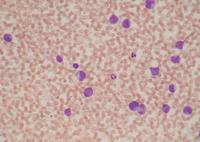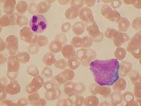 Abb. 5: Hiatus leucaemicus, AML M5a. Es überwiegen Monoblasten, in Bildmitte finden sich zwei segmentkernige Neutrophile und ein Lymphozyt (Objektiv 20x).