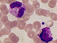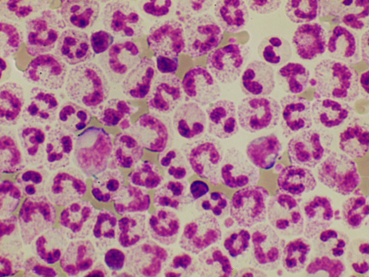 Döhle-Körper waren auch in einem Zytozentrifugenpräparat zu erkennen. Einerseits sind die neutrophilen Granulozyten durch die Bearbeitung mit der Zentrifuge optimal ausgebreitet, zum anderen ist die neutrophile Grundfarbe reduziert, so dass sich auch kleinere basophile Flecken kontraststärker abheben.
