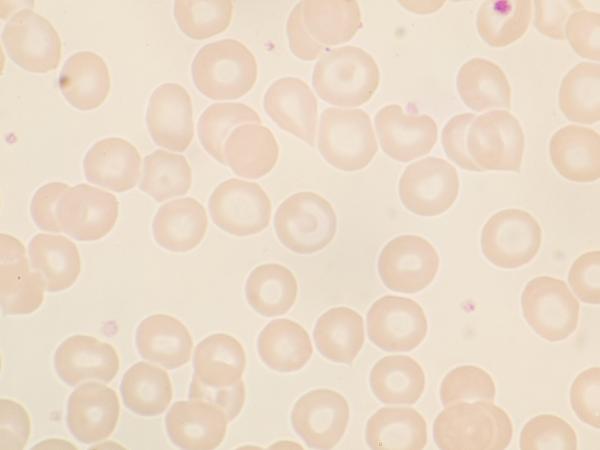 Abb. 1: Blutausstrich bei Zustand nach Splenektomie. Vermehrt Thrombozyten und Granulozyten. Die Erythrozyten zeigen Anisozytose, häufiger zeigen sich Akanthozyten, rechts unten auch zwei Targetzellen (Pfeile) - (Objektiv 40x).