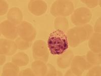 Abb. 1: Ausstrich, Plasmodium vivax, erweiterte Ringform, Schüffner-Tüpfelung