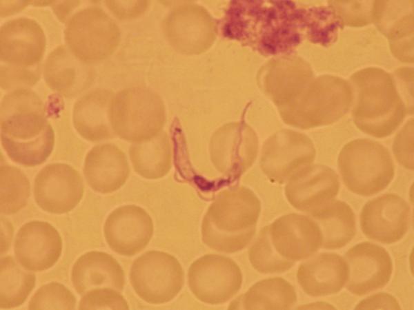 Abb. 1: Trypanosoma brucei gambiense, Patient, Blutausstrich (25-40 µ), morphologisch (Salivaria) nicht unterscheidbar von T. brucei rhodesiense. Die Blutformen der Erreger sind gekennzeichnet durch einen Zellkern, punktförmigen Kinetoplasten am Zellhinterende, in dessen Nähe das Basalkorn liegt, dem die Geißel entspringt, die über eine undulierende Membran wellenförmig am Zellkörper entlang nach vorne verläuft und mit einem freien Geißelende ausläuft ("slender forms"). Dieses freie Geißelende variiert in seiner Länge (Polymorphismus) bis hin zum Fehlen der freien Geißel bei kurzen, breiten Formen ("stumpy forms", die nicht mehr teilungsfähig sind mittels Längsteilung).