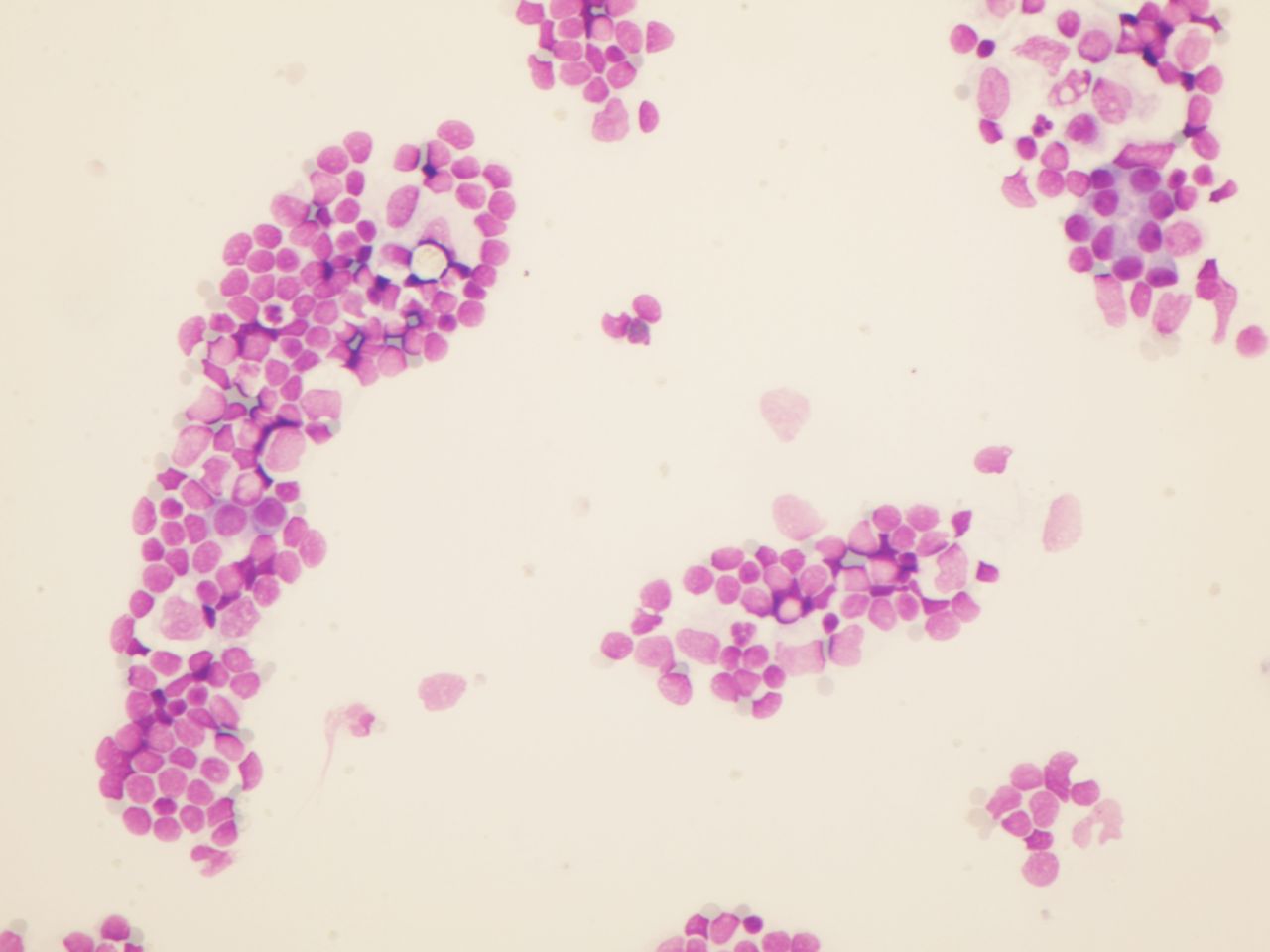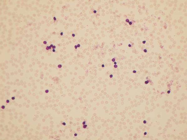 Beschreibung/Beurteilung der Bildserie: In diesem Blutausstrich (Abb. 1-7) finden sich in den blau eingekreisten Arealen an umschriebener Stelle vermehrt Lymphozyten (Abb. 3-7), die zum Teil aneinander liegen. Das steht in völligem Gegensatz zu der Leukozytenzahl, sowie der Lymphozytenhäufigkeit und -verteilung im übrigen Ausstrich. Auch von der maschinell gemessenen Leukozytenzahl mit einem sehr geringen Lymphozytenanteil war das nicht plausibel. Die Erklärung gibt das Präparat mit der nächsten fortlaufenden Nummer, das im Färbebad bei der automatischen Färbung direkt daneben gestanden hat (Abb. 8-10). Es handelt sich um das Zytozentrifugenpräparat eines lymphozytenreichen Pleuraergusses. Von diesem Präparat sind Zellen abgeschwemmt worden und haben sich auf dem Blutausstrich festgesetzt. Der Blutausstrich ist sehr arm an Leukozyten und man findet nur wenige Lymphozyten. Diese liegen zwischen den Erythrozyten. Im Gegensatz dazu überlagern die verschleppten Lymphozyten häufig die Erythrozyten und sie weisen auch Formveränderungen auf, die durch die Zytozentrifuge verursacht sind.