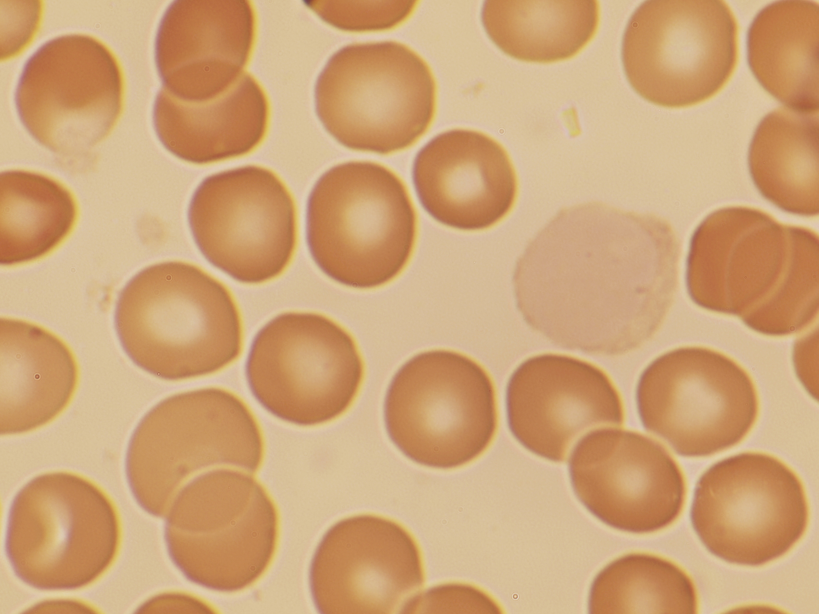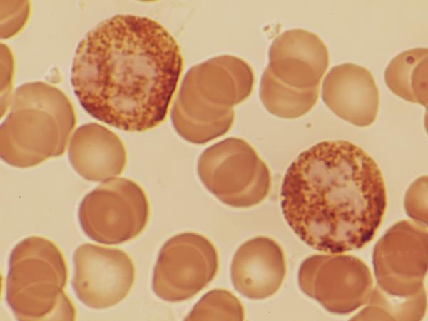 Darstellung der Myeloperoxidase mit einem Kit der Fa. Sigma Diagnostics, Substrat p-Phenylenediamine und Catechol, Ergebnis ist ein schwarz-braunes unlösliches Reaktionsprodukt, das die Primärgranula der myeloischen Reihe anfärbt (Abb. 1 und 2). Die Substanz ist nicht karzinogen. Lymphozyten sind Peroxidase-negativ (Abb. 3). Monozyten geben eine schwächere und etwas feiner granuläre Reaktion (Abb. 4).