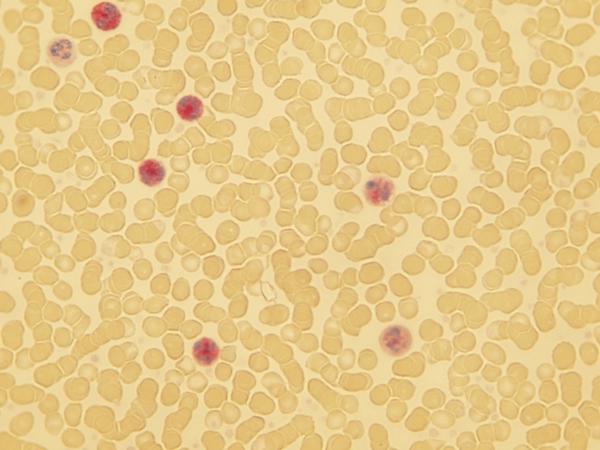 Abb. 1a: ALP bei myeloproliferativer Erkrankung, Übersicht (Objektiv 20x).