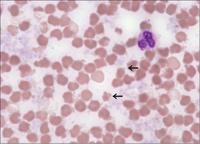 Striations with a blue cast and parts of the erythrocytes broken off, due to overheating of the blood sample (storage in the car with the sun shining on it).