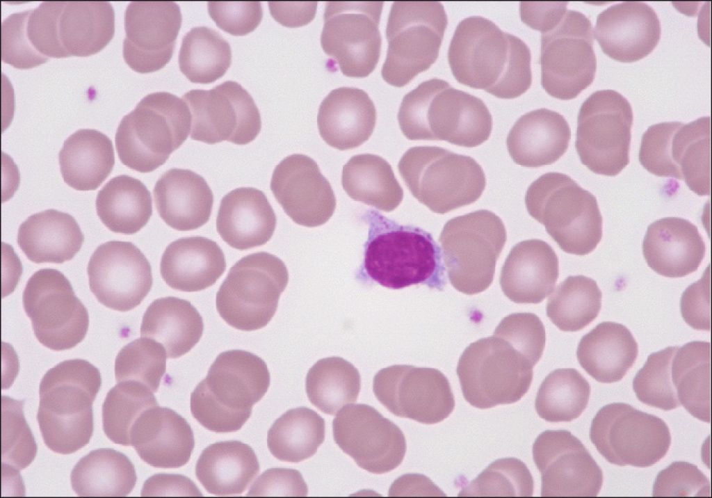 Zytoplasmaausstülpungen eines Lymphozyten im Blut einer Normalperson. (Solche Ausstülpungen findet man zwar gehäuft bei Infektionen, im Gegensatz zu echten "Reizformen" haben sie jedoch keine diagnostische Bedeutung.)