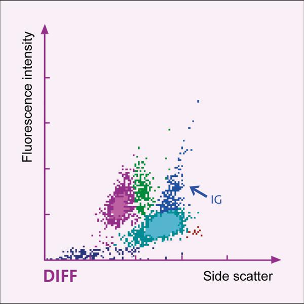 The haematology analysers SYSMEX XE-5000, XE-2100, XT-2000i and XT-1800i can measure and display the fraction of immature granulocytes (IG, blue area). Elevated numbers of immature granulocytes may, among other conditions, be present in sepsis